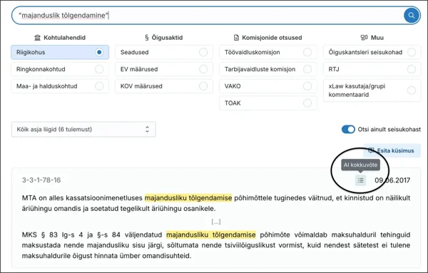 xLaw AI kokkuvõte lahendite otsingutulemustes