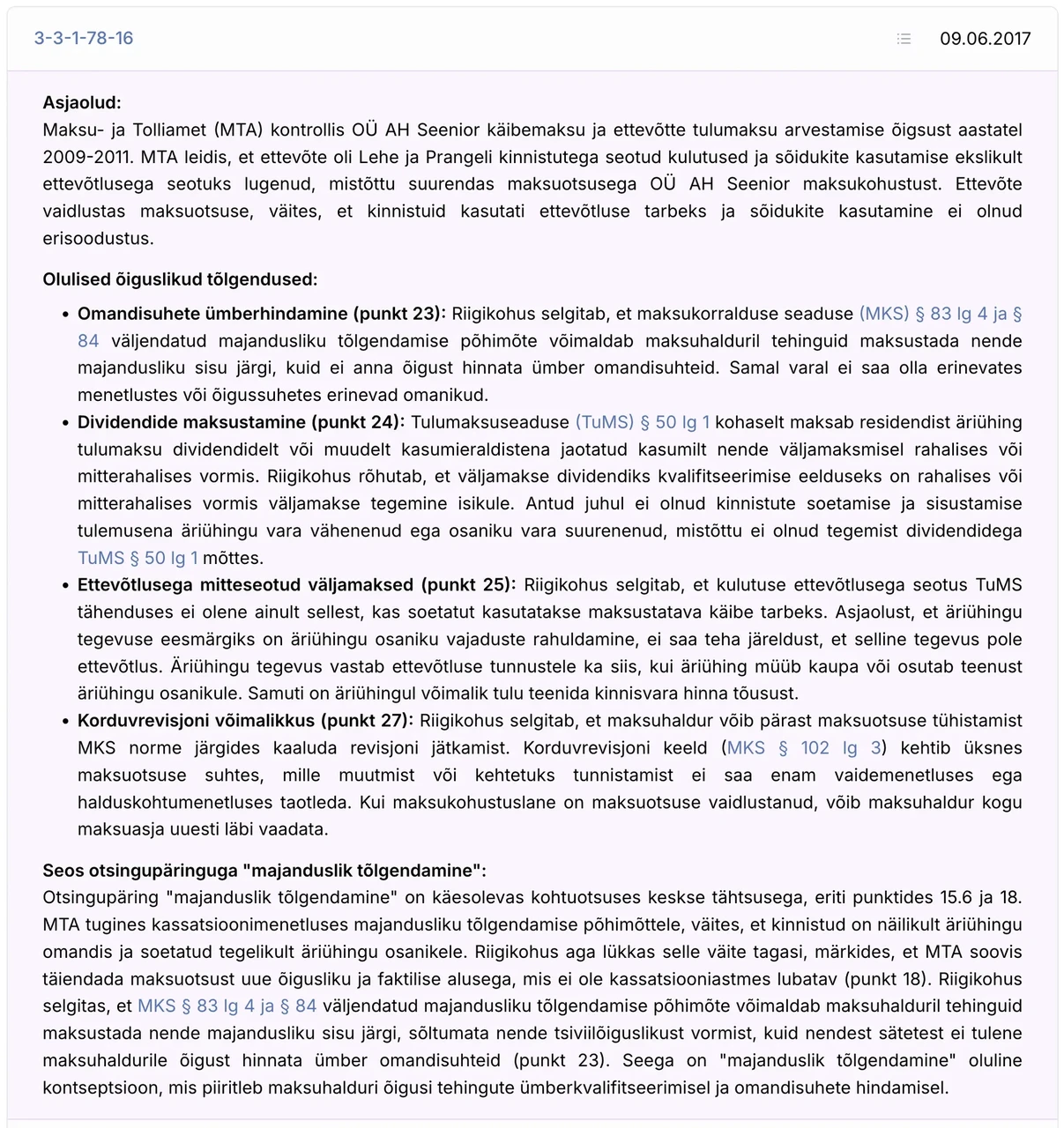 Lisaks eeltoodule, on võimalik koostada AI kokkuvõte seadusesätte tõlgendusest, arvestases Riigikohtu praktikat