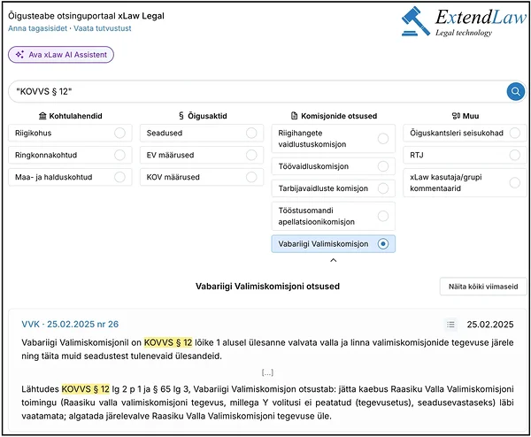 Õigusteabe otsinguportaalis xLaw Legal (legal.ee) saab nüüd otsida ka Vabariigi Valimiskomisjoni otsuseid.